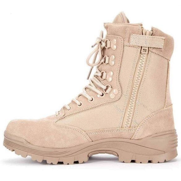 A német MIL-TEC éáltal gyártott kiváló minőségű, mégis kedvező árú bőr-gyöngyvászon kombinációjú THINSULATE bélésű , DESERT SZÍNŰ oldalt zippzáros bakancs.