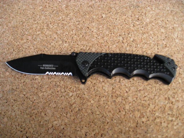 Általános felhasználású,masszív,szénacél pengéjű,csapágyazott nyitószerkezetű,biztosítózárral ellátott kés.C.J.HERBERTZ